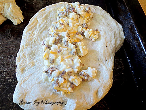 Take a ball of dough and spread it thin on a greased cookie sheet..... then put a line of filling down the center.